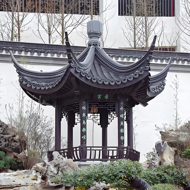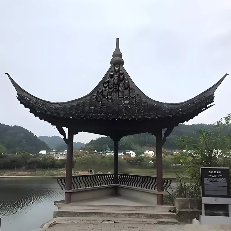 Подржава прилагођавање нестандардне величине (3000-6000 мм), покривајући класичне Хуизхоу форме као што су павиљони са четири угла, павиљони са шест углова и павиљони са осам углова. Опције за дрво укључују борнеол, јелу, конзерванс бор, итд., а врсте плочица се могу прилагодити малим зеленим плочицама и цилиндричним плочицама. Инсталација усваја бетонску подлогу за фиксирање стубова, структуру урезаних и шипавих спојева на лицу места како би се избегло насилно склапање које оштећује чепове. Кров постављају професионални керамичари у складу са занатским умећем Хуизхоуа како би се обезбедила несметана дренажа, а целина задржава правилност и шарм древне архитектуре Хуизхоуа.